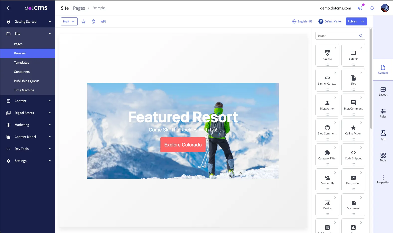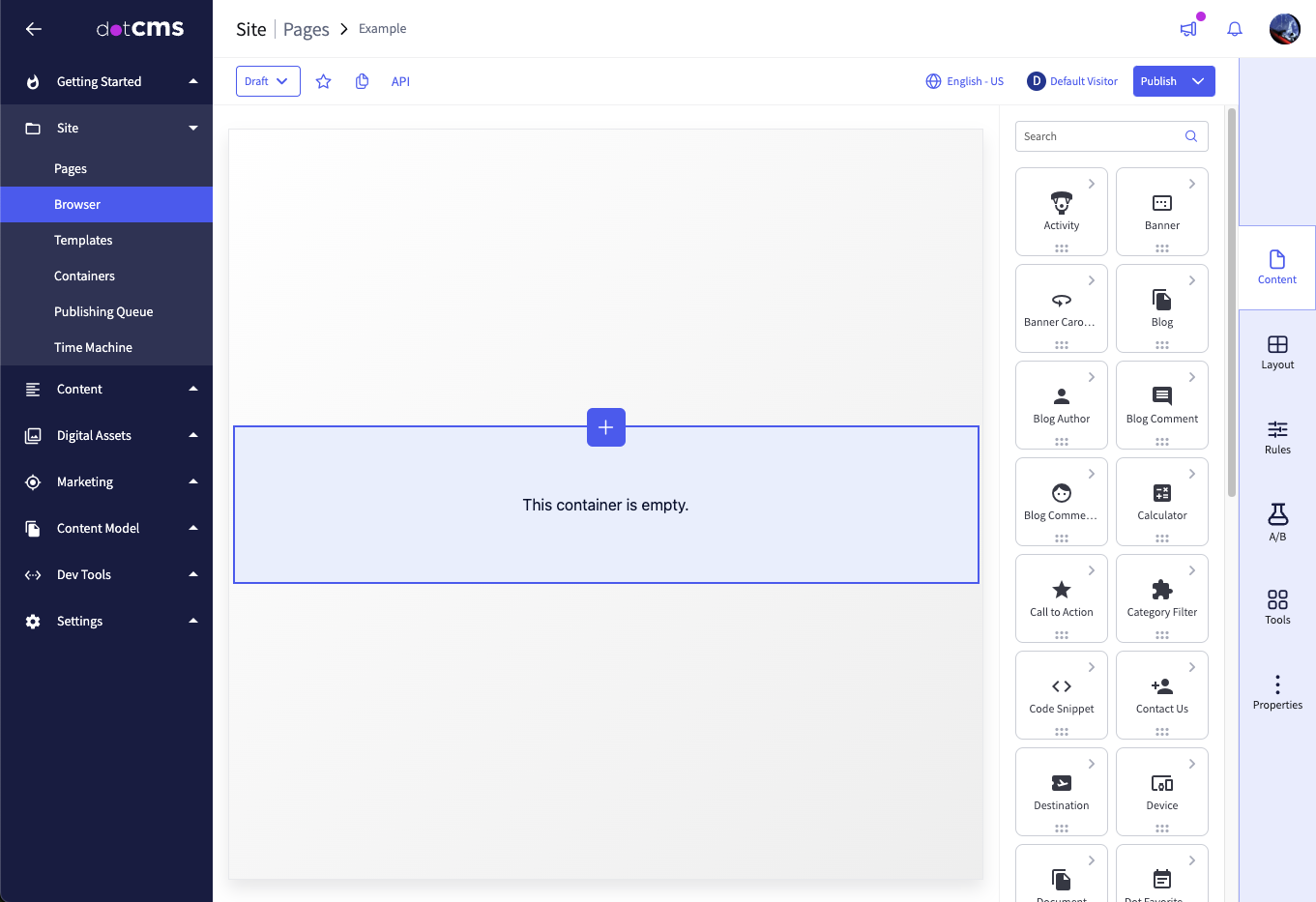 Let’s create the page we’ll use in this tutorial. Follow these steps to create the page in dotCMS: