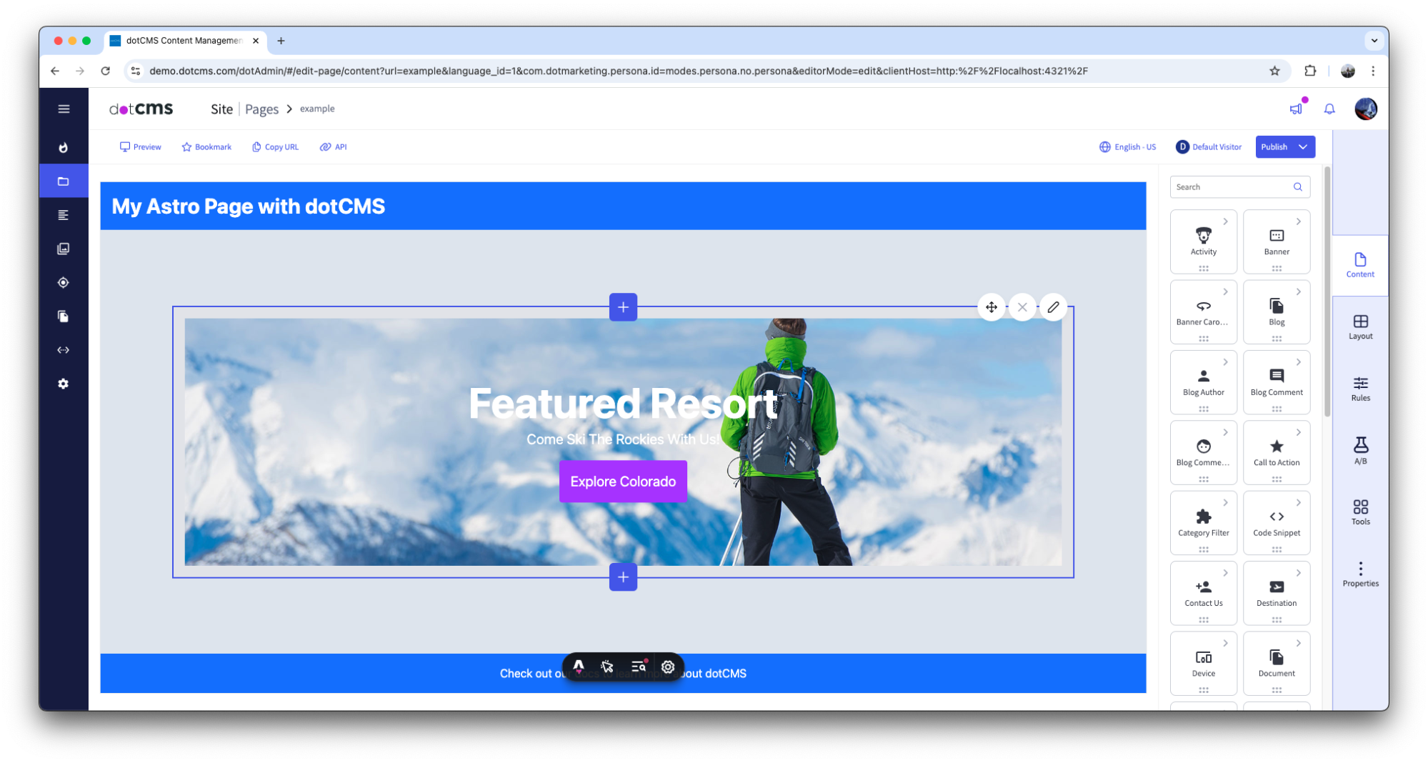 We now have an Astro page within dotCMS. The next step is to make it fully editable. This will allow content authors to modify the layout or content, and see their changes right away on the page.