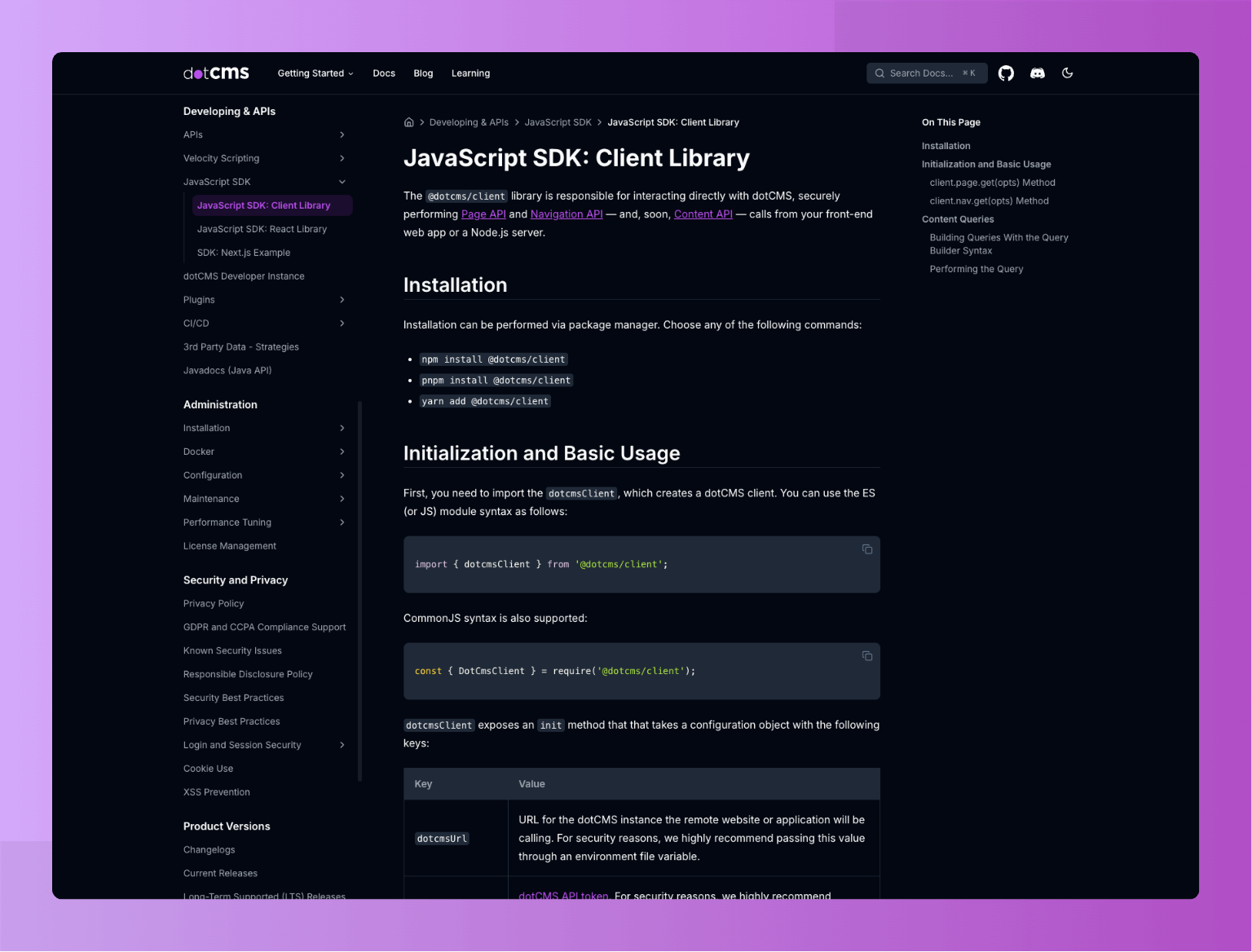 Provides a seamless transition: Developers should feel like they’re still in the dotCMS ecosystem when moving between the marketing site and the developer site.