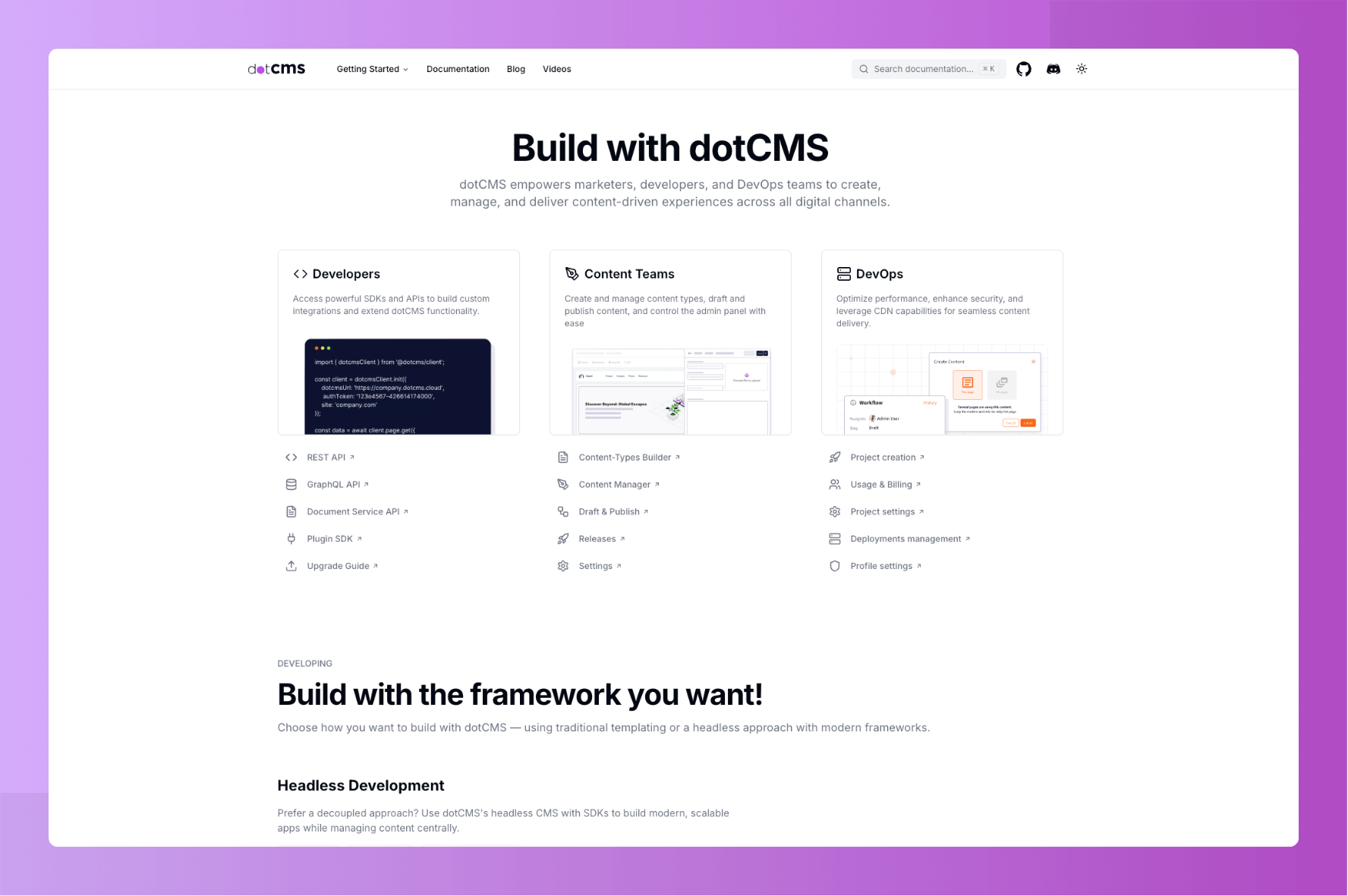 Recently, we completely refreshed the dotcms.com website with a modern look and better branding. With that major update, it became clear that our developer site needed a redesign too—both to stay on brand and to improve how developers access our content.