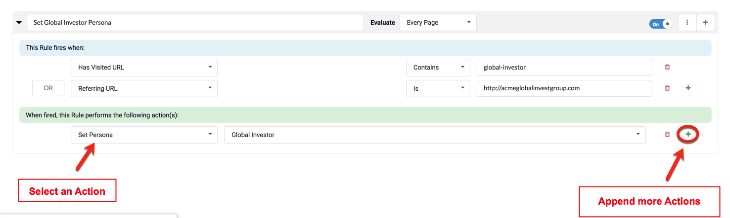 The image below displays some Conditions based on the site visitation history OR referring URL. If either of the Conditions result to be TRUE, the "Set Persona" Action will execute. In this case, the Action will set the Persona to "Global Investor" and the data delivered to the site Visitor will become more customized.