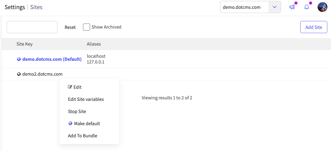 | Add To Bundle | Adds the site to a bundle for push publishing to another dotCMS server. |