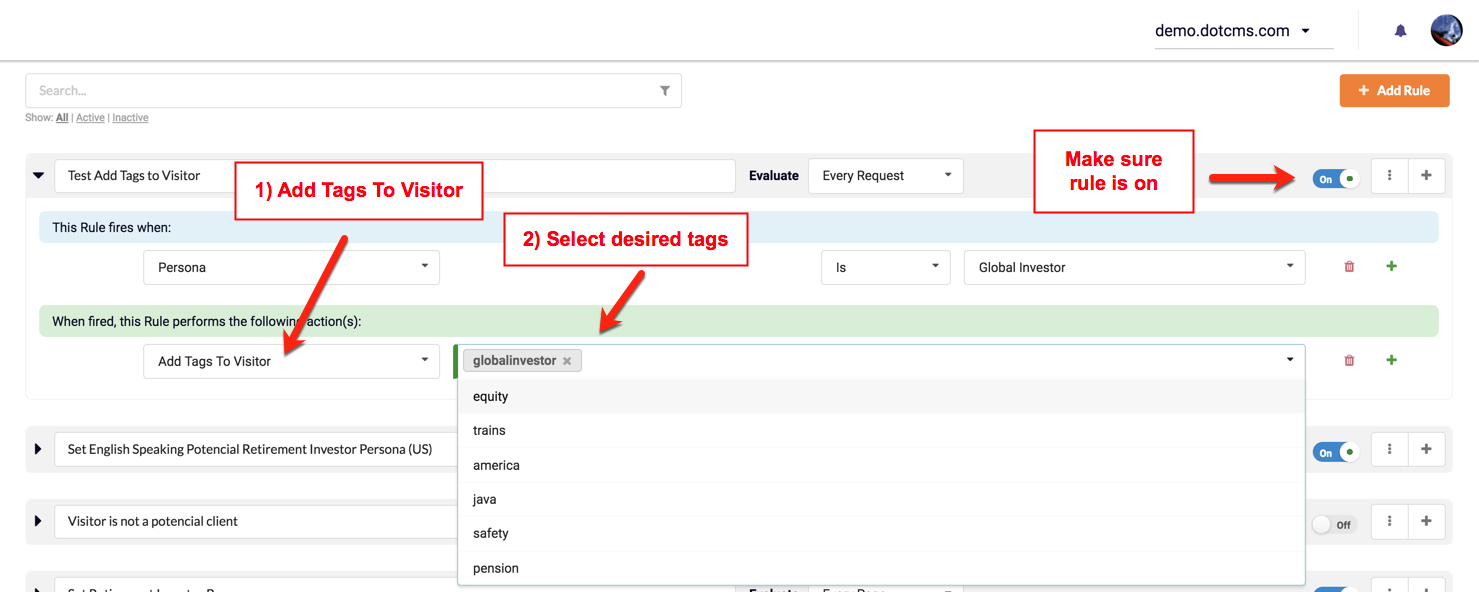 Important Reminder: The Rule must be set to ON for the Tags to be set on the Visitor object by the Action.