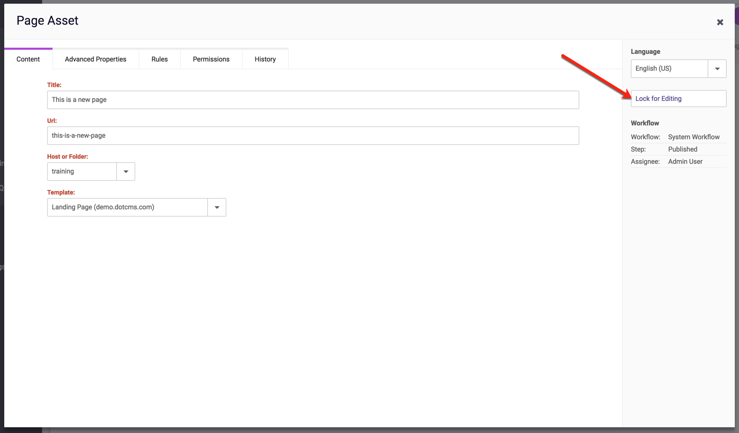 To add content to the page, choose Lock for Editing from the action sidebar. New objects can now be added to the containers in the page (based on the Template assigned to the page):