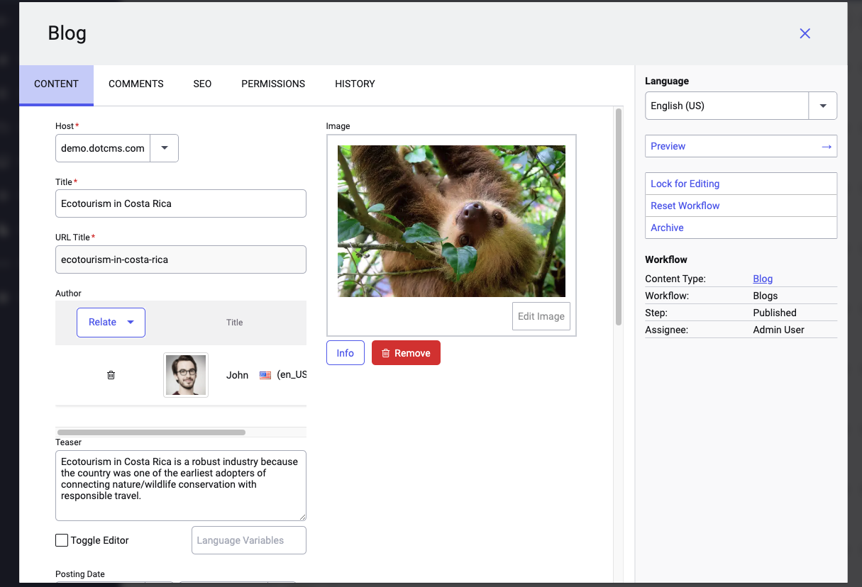 - Save/Assign: Creates a draft/"working" copy and workflow task for the content to be reviewed/edited/published by another dotCMS user.