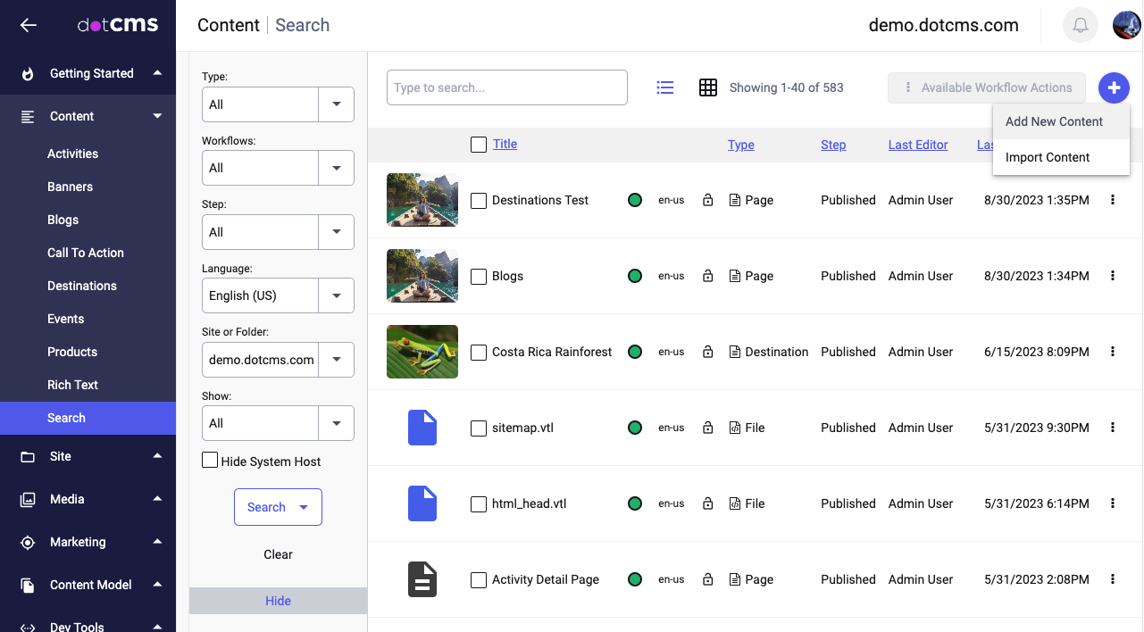 - Right-click options on Content will vary depending on the current status of the Content (Published, Unpublished, or Archived).