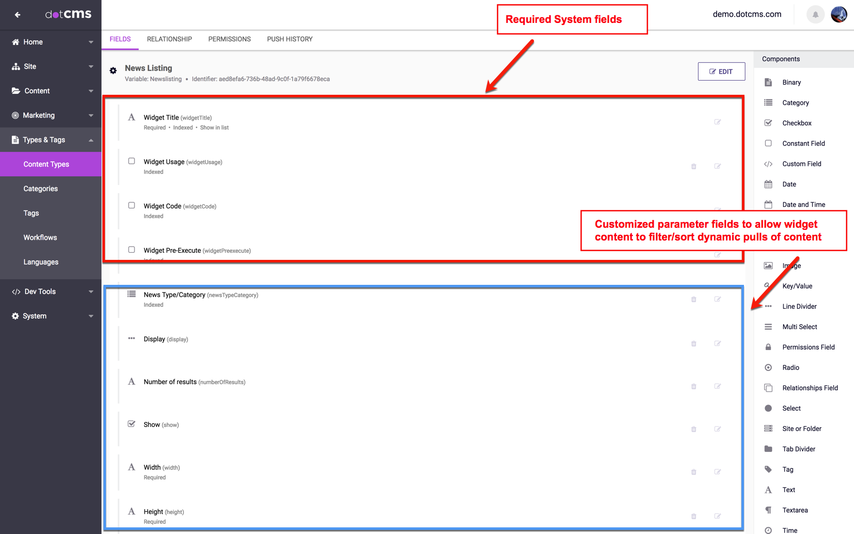 Custom fields example on the News Listing widget (demo.dotcms.com)#