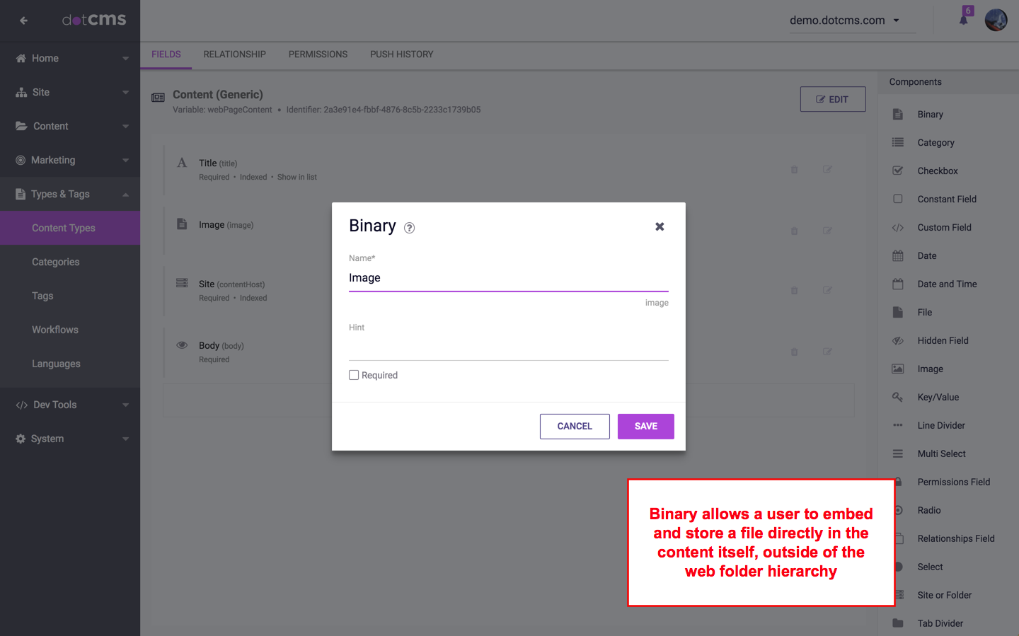 Adding a Binary Field to a Content Type allows the user to embed and store any file directly in the content itself without placing that file in the Site Browser hierarchy.