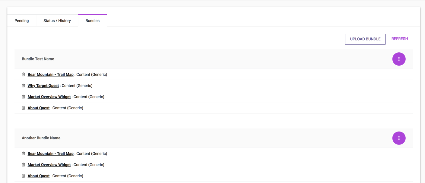 This displays a list of all Bundles and their content, and provides options to perform the following actions: