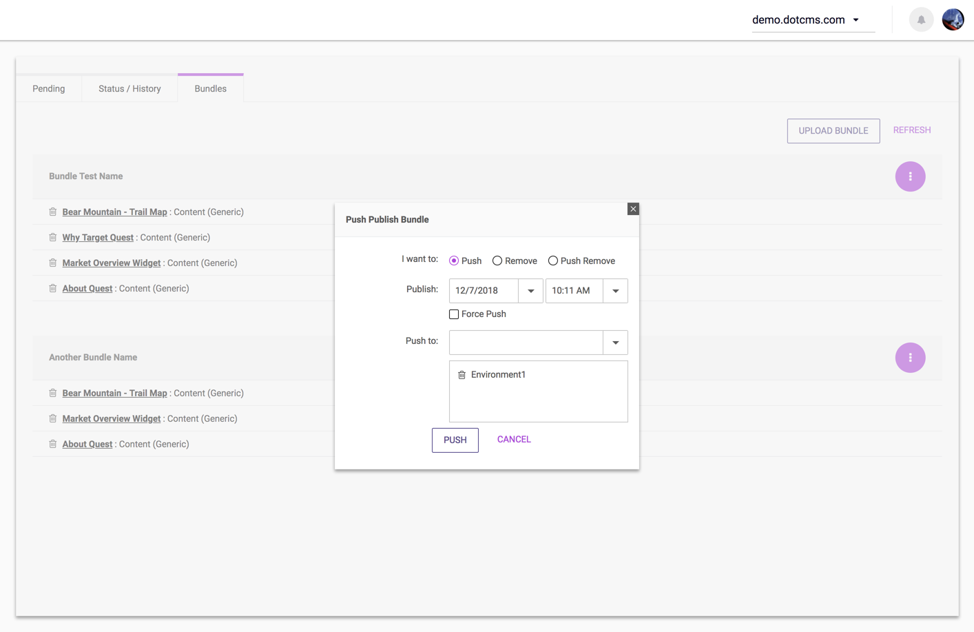 Please Note: There are different bundle considerations to be accounted for when push publishing to either Static or Dynamic endpoints. Please refer to the Static and Dynamic Publishing documentation before sending objects between servers.