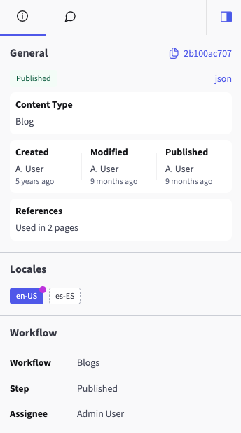 The right-hand sidebar displays content metada, subdivided across tabs.