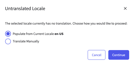 Next, a locale selector permits switching between different language versions of the contentlet. It also provides a quick way to populate a different language version if one does not exist — that is, clicking a locale for which no content version exists will call the following dialog: