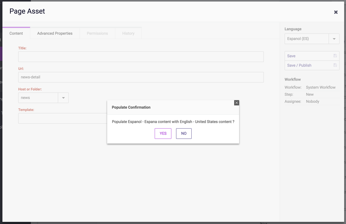 The first time you create a version of content in a new language, you'll be prompted to choose if you want to populate the content from the existing content in another language. To preserve the placement of links, images, files and other references in the content, choose Yes.