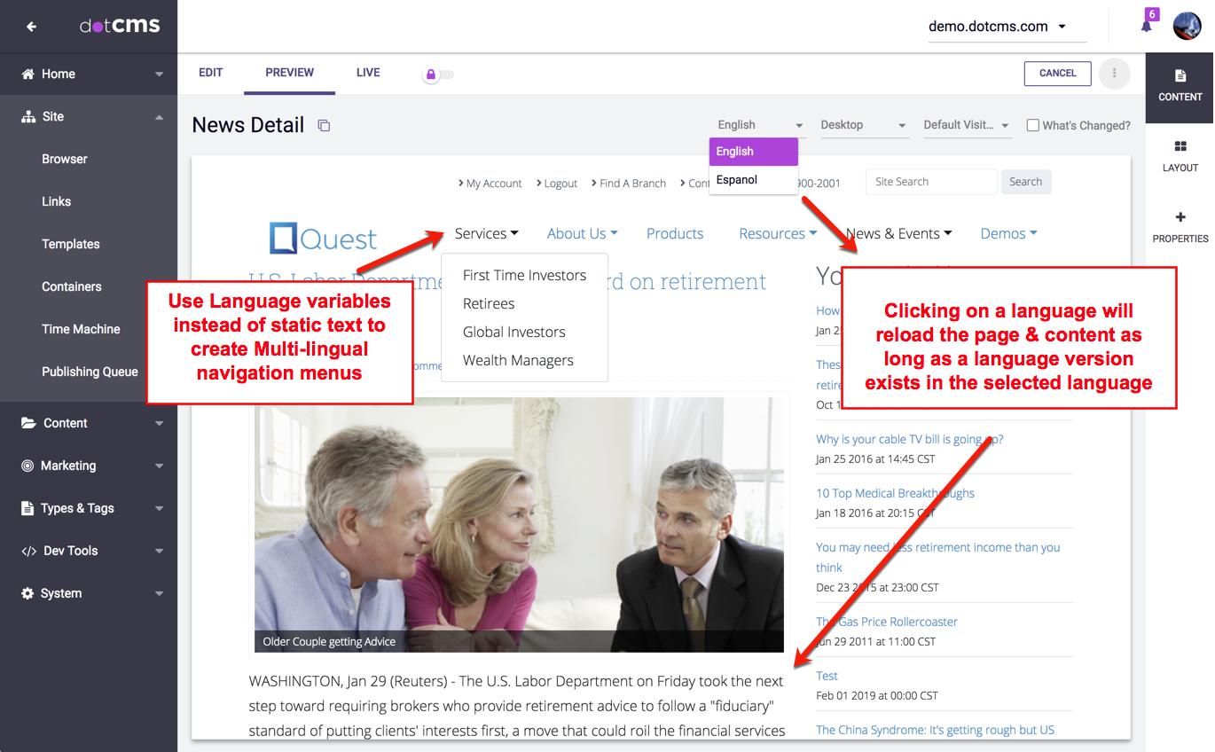 For more information on configuring dotCMS system properties to pull default language versions of content see the documentation on configuring languages, default languages, and pulling multilingual content.