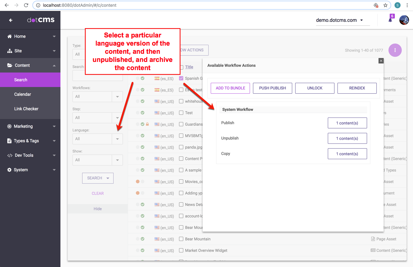 However, as of the dotCMS 3.7 version, specific language versions of a contentlet may be deleted without deleting the entire contentlet. To completely delete a specific language version of a contentlet or file, use the following steps: