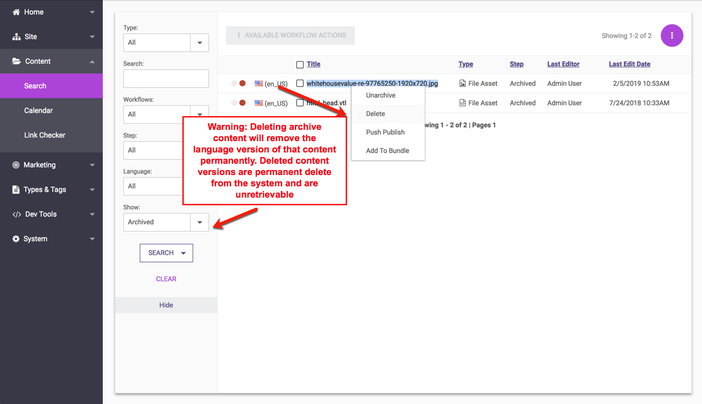 - The archived content language version is no longer visible. To fully delete the language version, choose the "Show" filter and select "Archived". Find the language version of the content you'd like to permanently remove, and click on the "Delete" button. The specific language version is permanently removed, but the other language versions from the same contentlet/file remain and are unaffected.