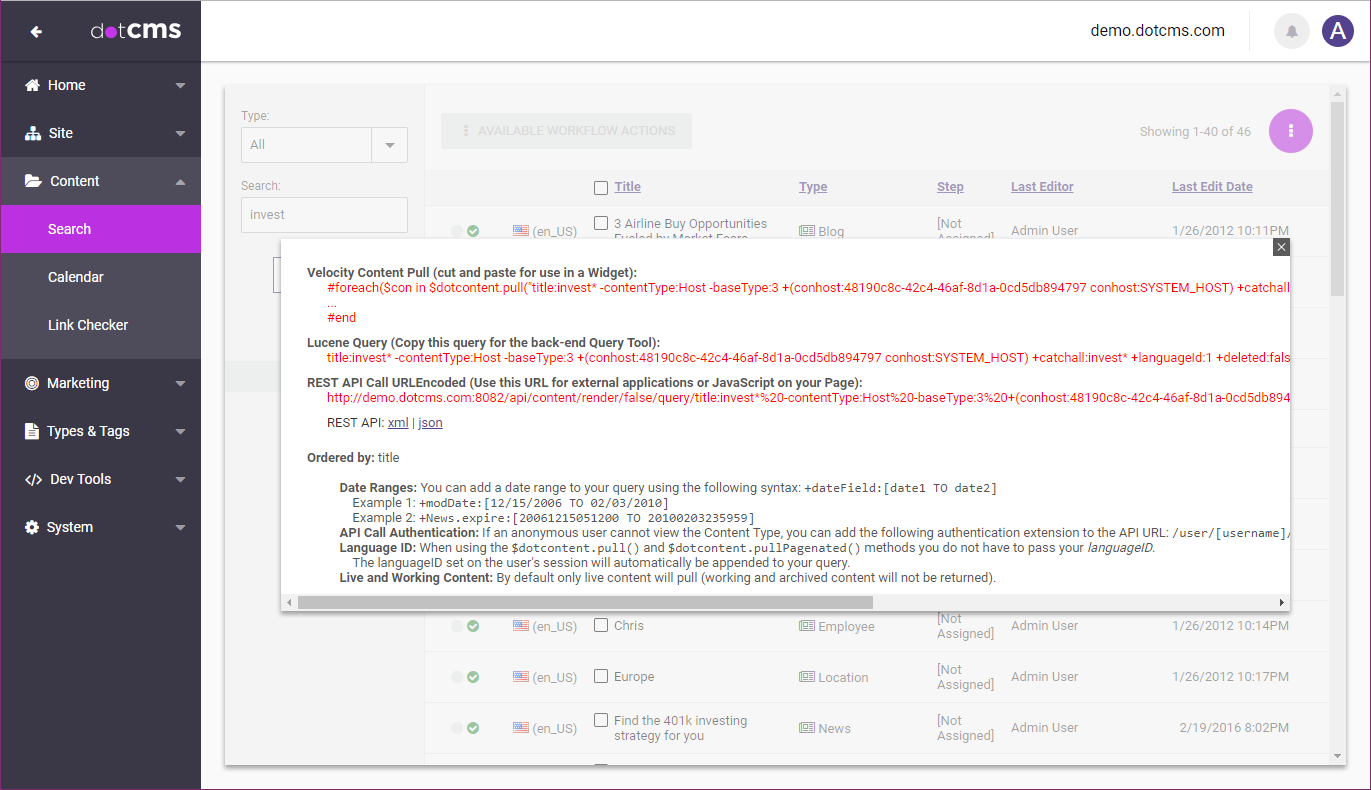Many tools in dotCMS allow you to specify the Lucene query syntax, eliminating the need to use the more complex JSON syntax. When you use a tool in dotCMS that accepts Lucene syntax, dotCMS automatically creates the full Opensearch syntax needed to perform the query in the background. You can use the exact same Lucene query syntax in all of the following ways within dotCMS: