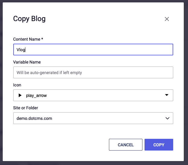 A modal dialog will pop up, prompting you to give your copy a new name. If desired, you can also specify a new icon, a new site or folder selection, or a custom variable name.