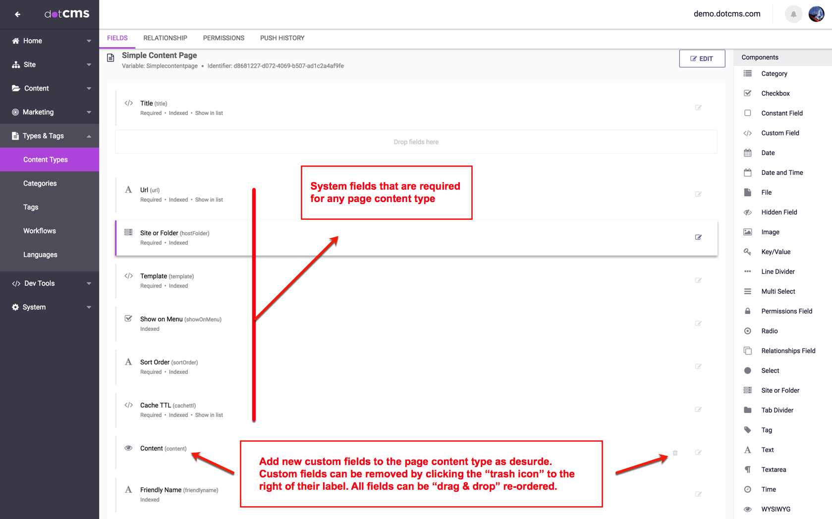 After saving the custom Page Content Type, several System Fields will be added to the Page Content Type automatically. The required Page fields include: