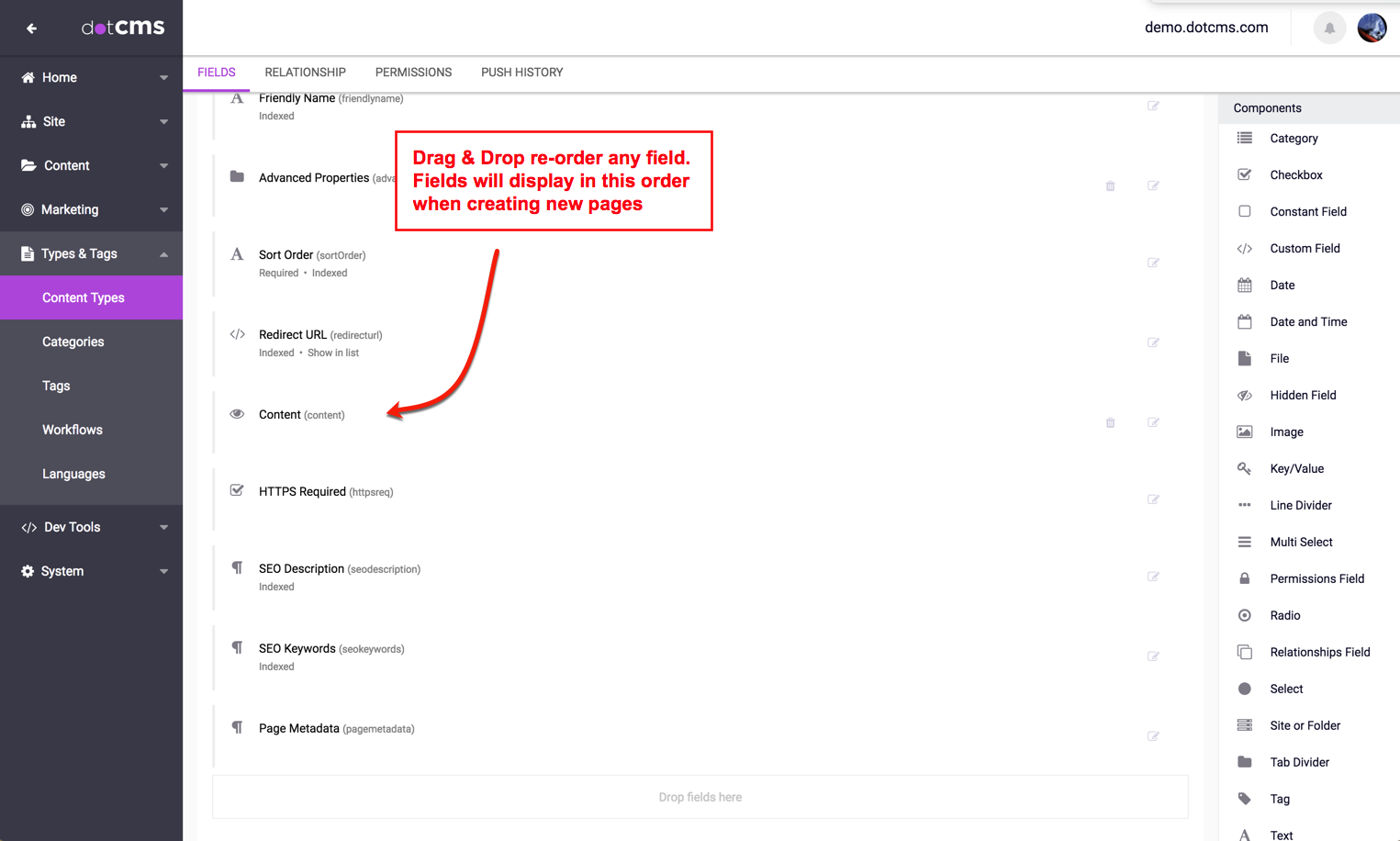 Both System Fields and/or custom fields can be "drag & drop" re-ordered to change the order that the fields will appear when adding new Pages.