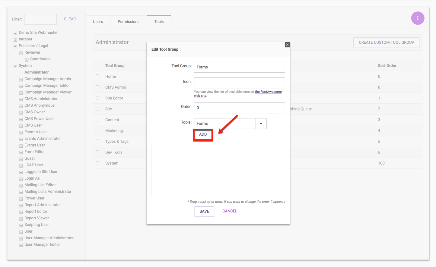 2. Select a Role that will receive access to the new custom Tool Group.