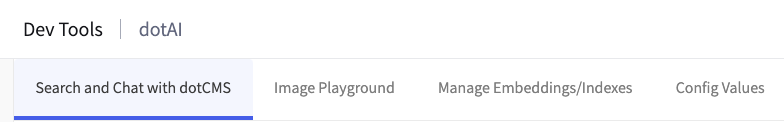 With the [dotAI feature] active, this tool will appear in the dotCMS back end under Dev Tools -> dotAI. It allows the immediate use of AI operations in context, as well as additional management and configuration options.