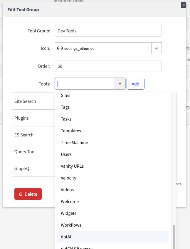 Click on the desired tool group. In the resulting dialog, choose dotAI from the Tools dropdown.