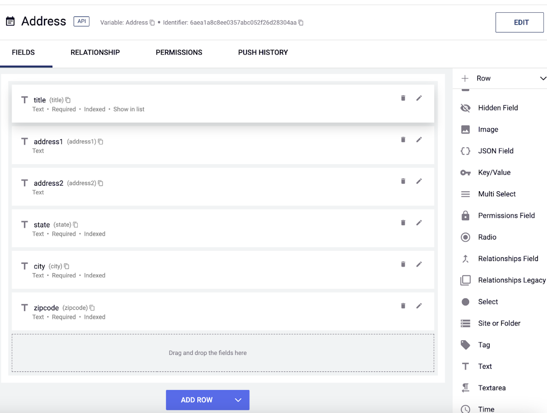 Address Content Type; fields are named title, address1, address2, state, city, zipcode.