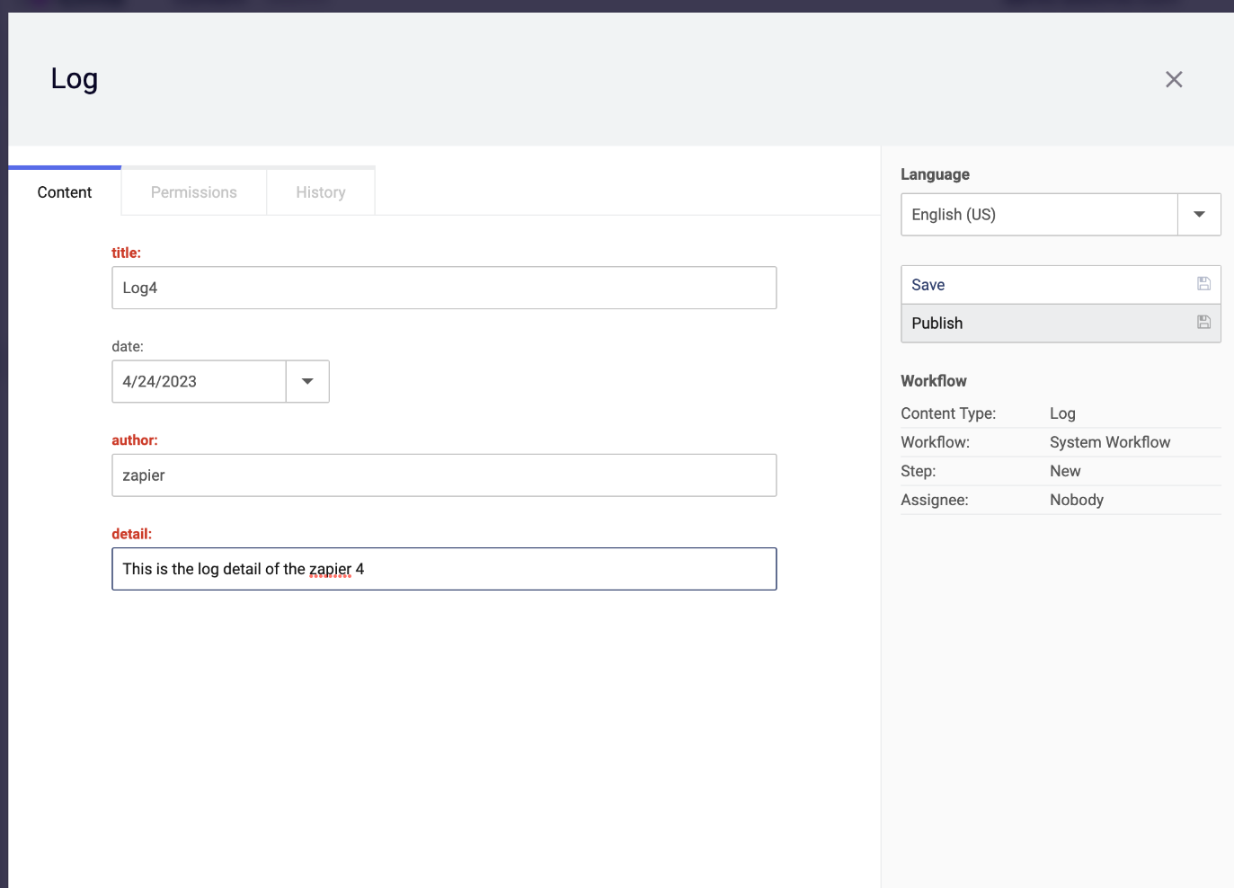 Log Content Type; fields are named title, date, author, detail.