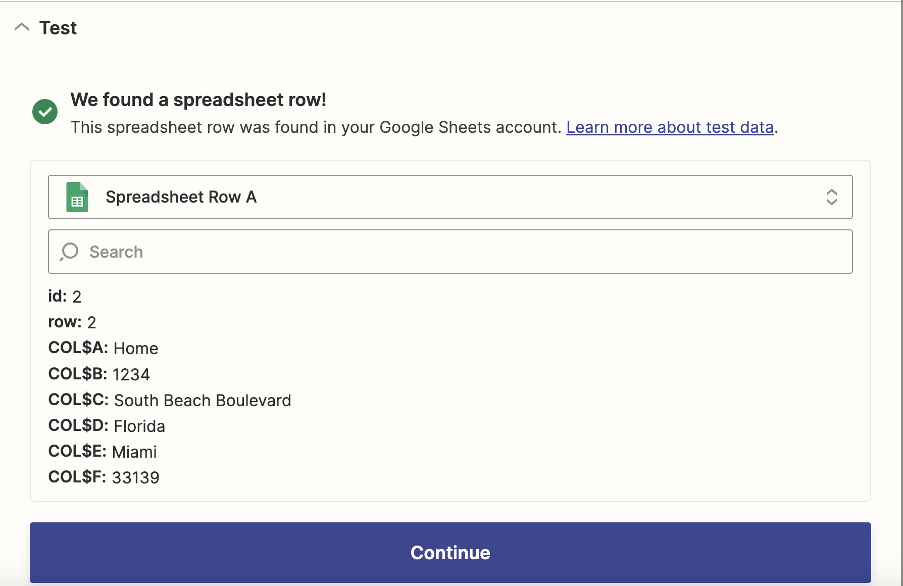 Zapier detects the spreadsheet content.