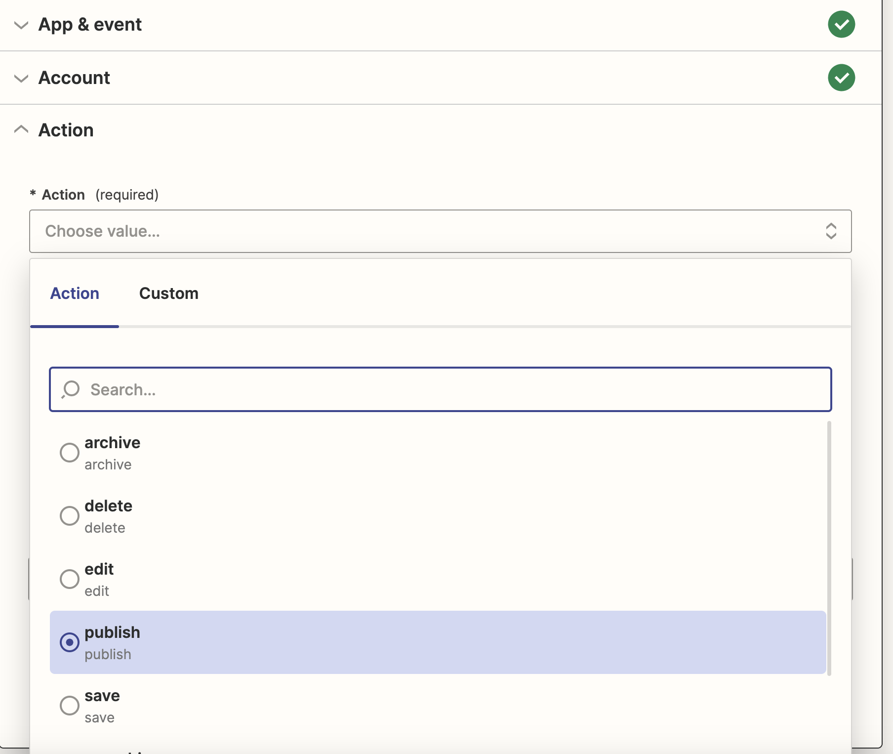 Selecting the workflow action from Zapier's side.