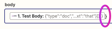 A more general workaround for sending JSON strings, which can apply to all manner of target applications, is to leave off the closing } character, and then configure the Zap to add it back on automatically.