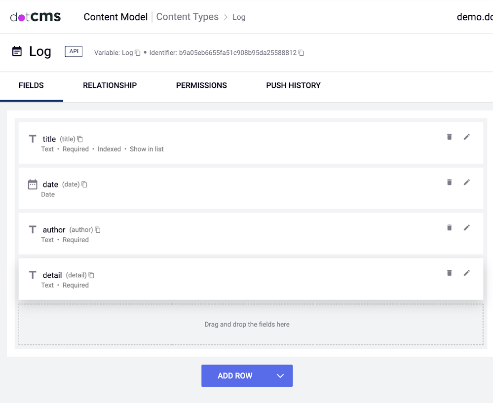 Next, we'll create a second Content Type: Log, consisting of a title Text field, a Date field named date, and two more text fields named author and detail.