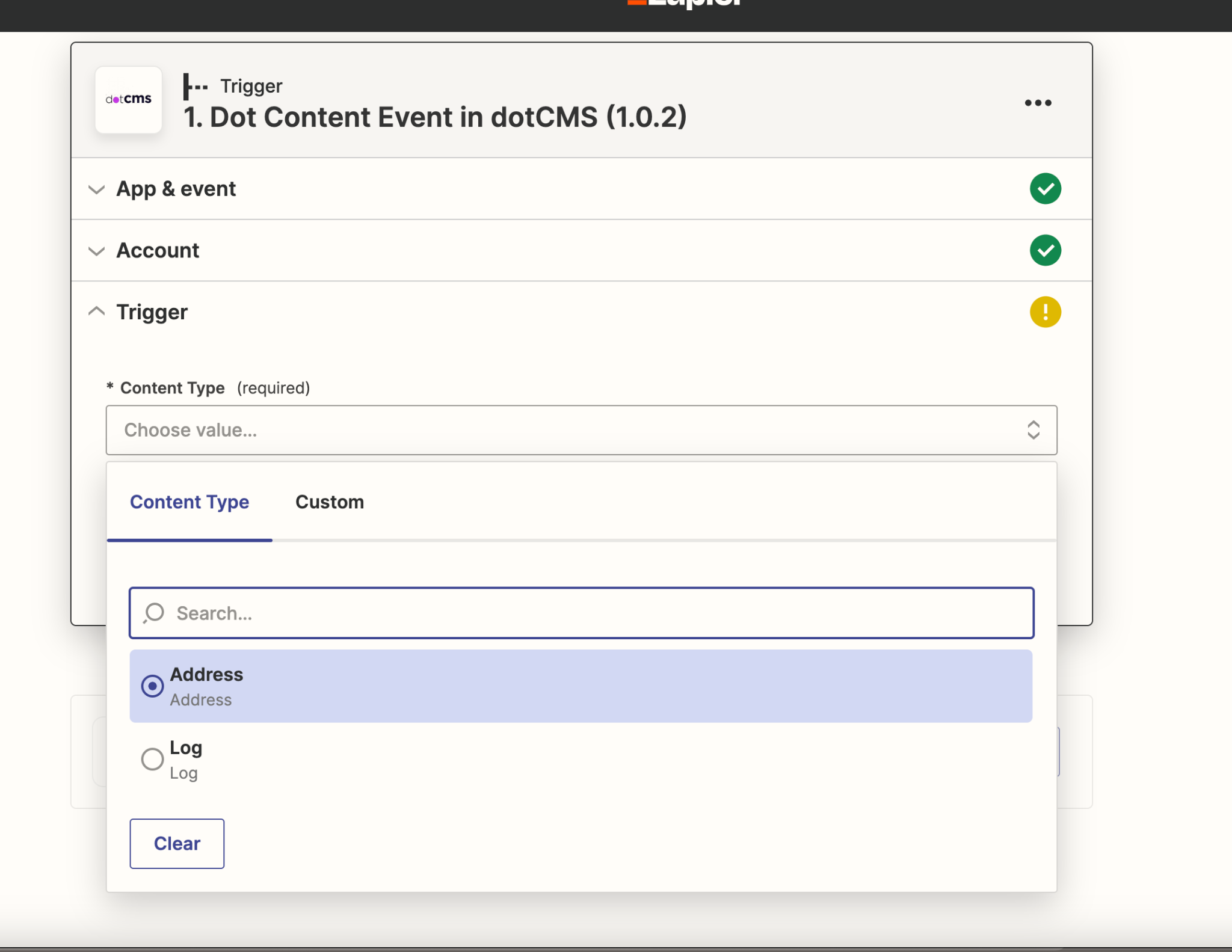 Next, you'll be prompted to set the event trigger that will determine when Zapier receives information from dotCMS. This means selecting the relevant Content Type. If everything was configured properly, only your two "dummy" content types should show up on the list.