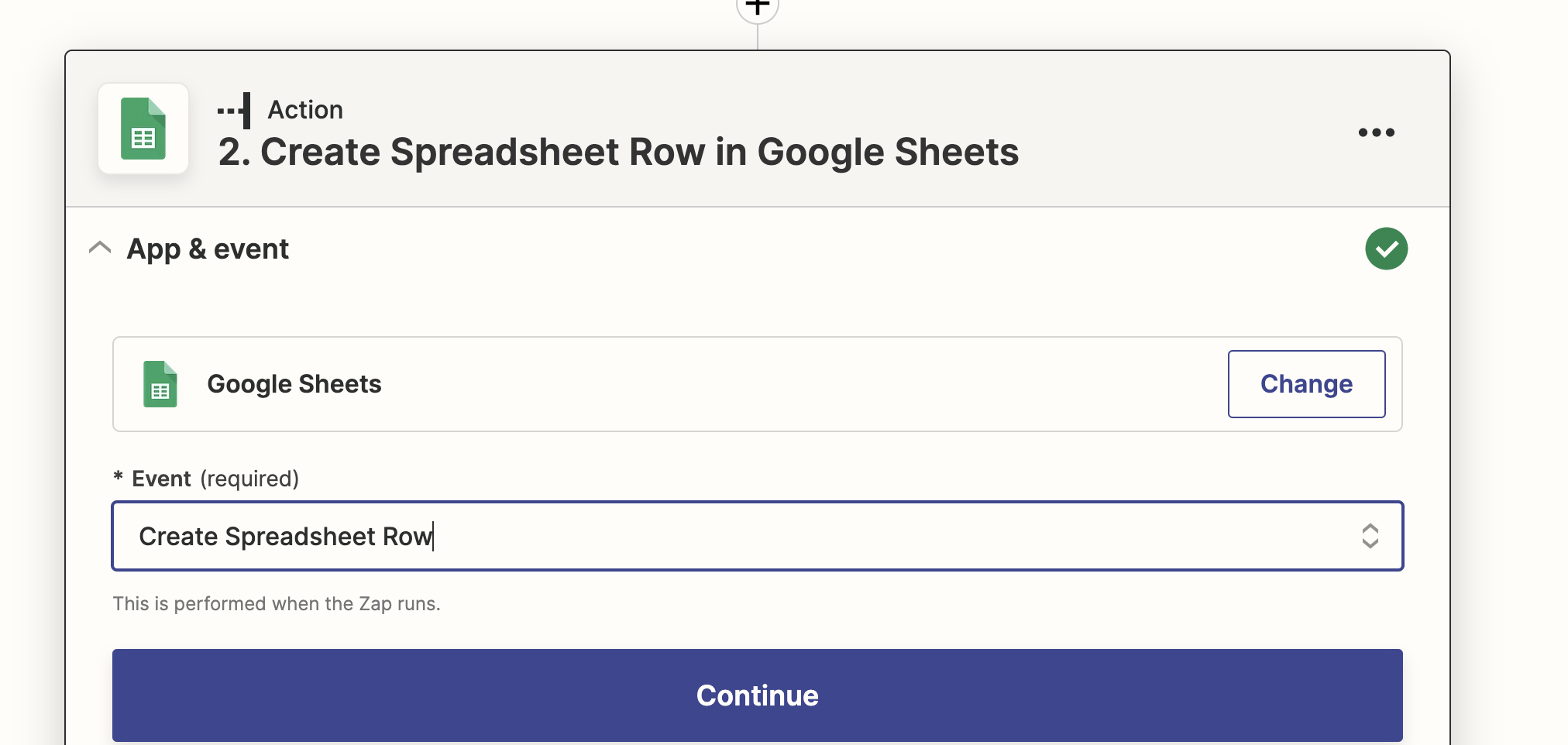 Selecting the Create Spreadsheet Row action in the zap.