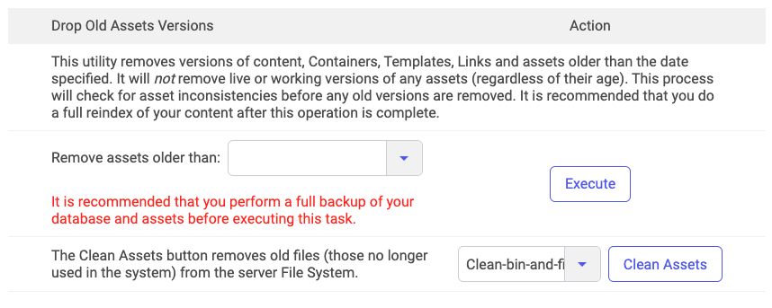 The Drop Old Asset Versions operation allows you to delete all assets older than a certain date. This operation will never delete any live or working content, no matter its age.