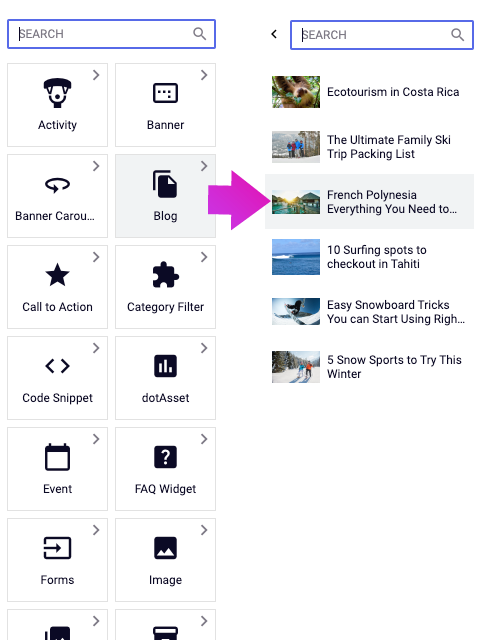 Drag and drop any item from this list to place it into a container. Alternately, you may drag and drop the Content Types themselves to create a new contentlet of that type and immediately place it in the container.
