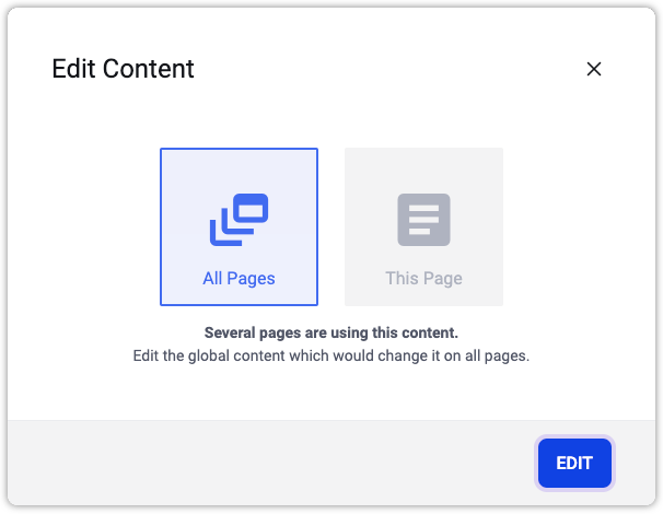 When selecting the Edit icon above a contentlet, a dialog will prompt the user whether this contentlet should be edited for all pages (default), or the current page only.