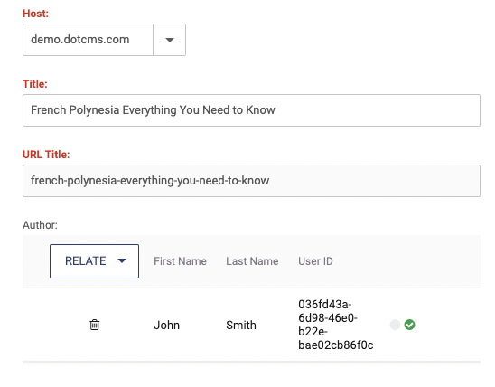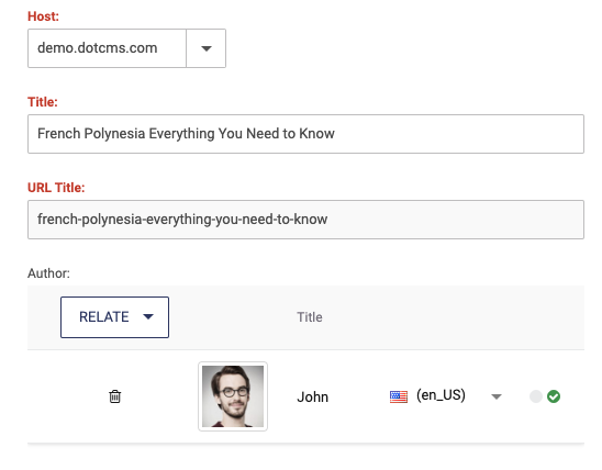 For a visual aid, here's a screenshot taken from a Blog contentlet on dotCMS's demo site, showing the default rendering of the related Blog Author contentlet, as seen by a user making a blog post: