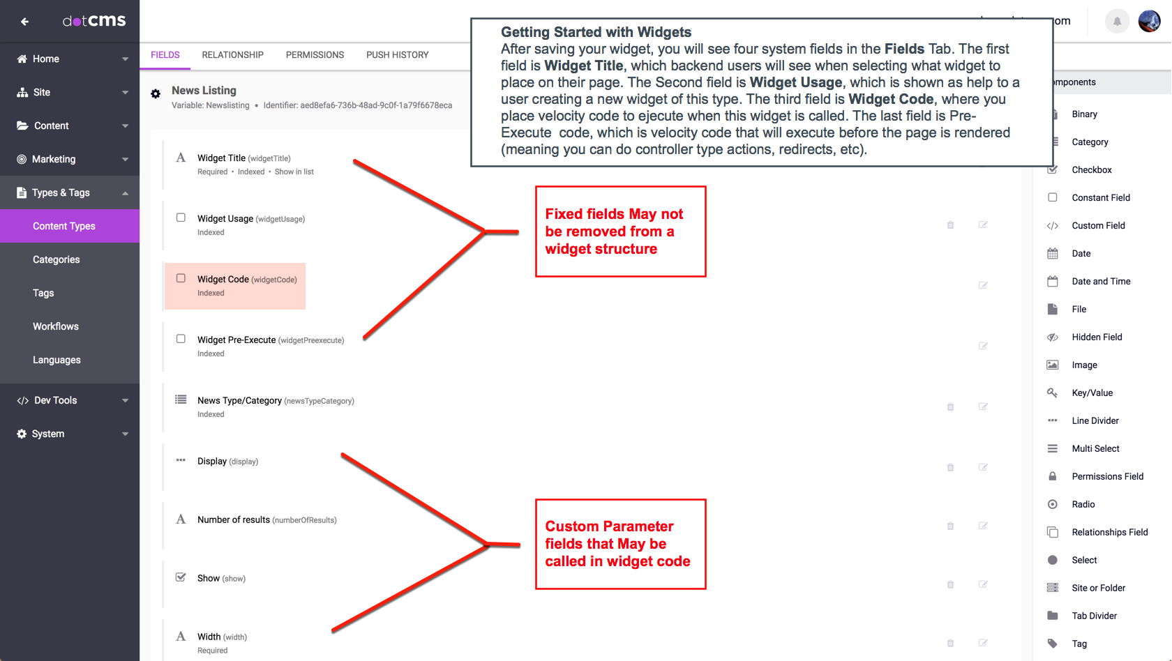 Widget Code - field for the dynamic velocity code that will be pulling the content and using any *Custom Parameter Fields the dotCMS webmaster may wish to provide for the content contributor