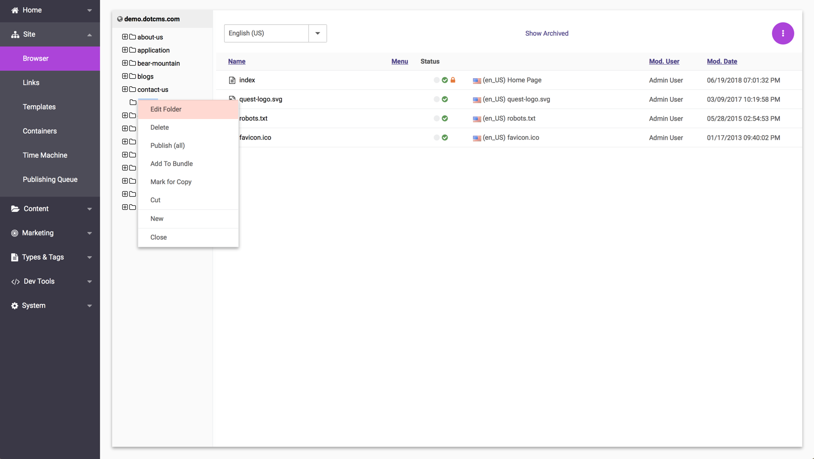 Although permissions can be set and inherited from the system host or set individually on folders and objects from the Website tab, as a general rule larger implementations will find setting permissions from the system host to be a more efficient and centralized permissions management strategy whereas smaller implementations may prefer the convenience of setting permissions on objects from the the Site Browser tab. The dotCMS is flexible and allows users to implement their own permissions management style using either method.