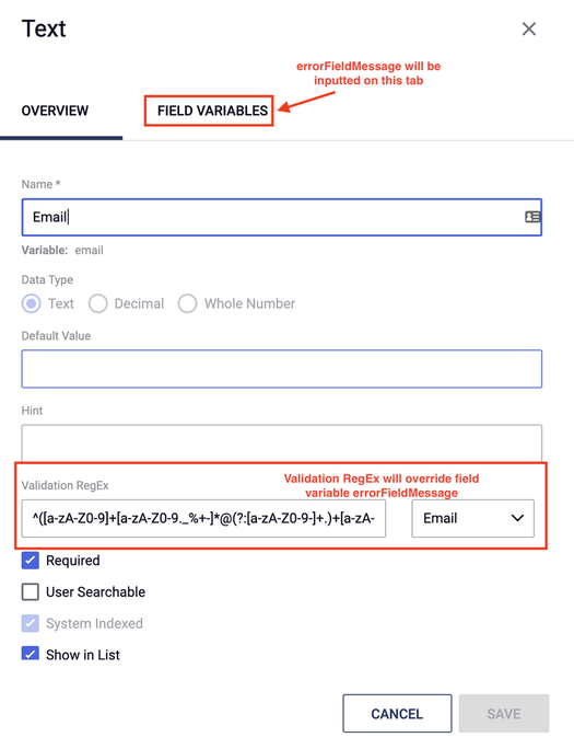 - Click on the "Field Variables" tab, and add a field variable with "errorFieldMessage" (case sensitive), as the Key of the field value. Write the custom message you would like to show in the Value field. If this field property is set, then the custom messaging typed in the Value field for the Field Variable will be displayed instead of the default validation messaging on the form.