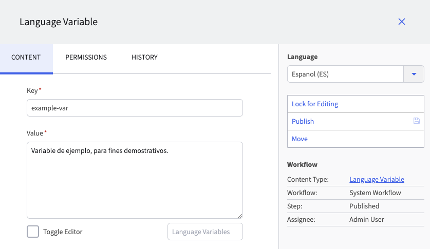 - It is recommended that you always have a version of each Language Variable in the Default Language, so when creating a new language variable, if you do not change this property, a version for the Default Language will be created.