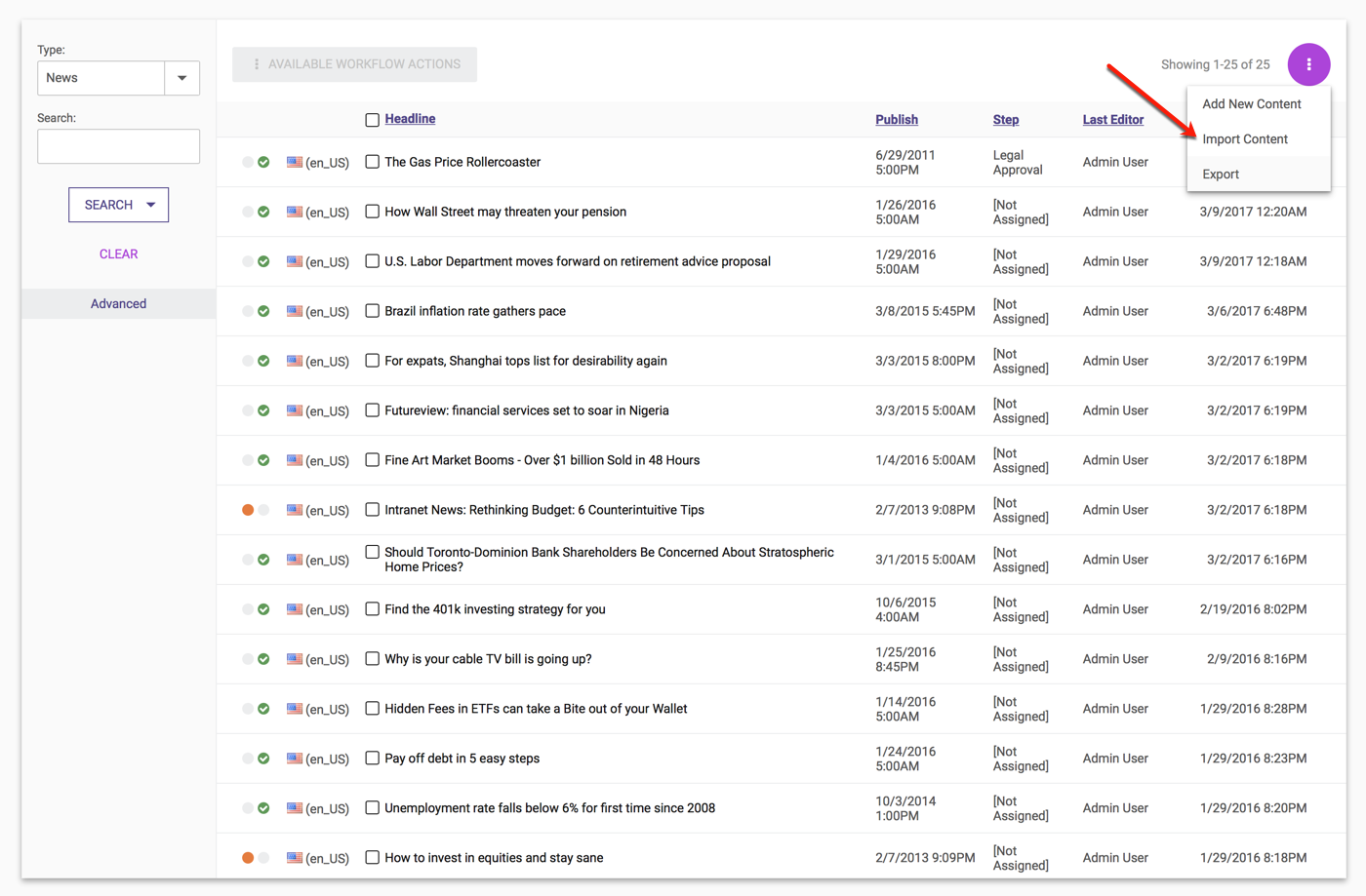You can also import related content from the Content Search screen. Please see the Importing Related Content documentation for more information.