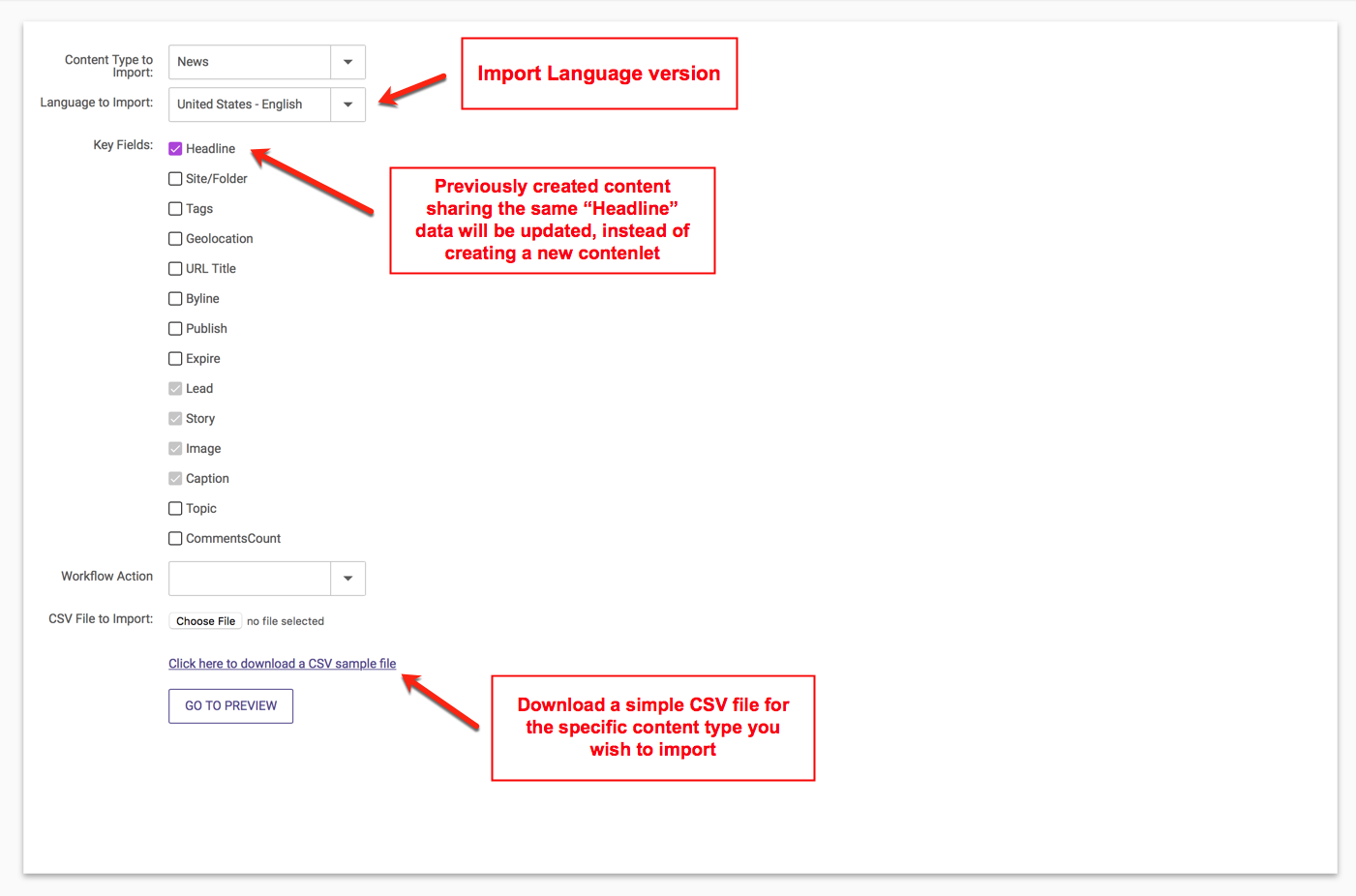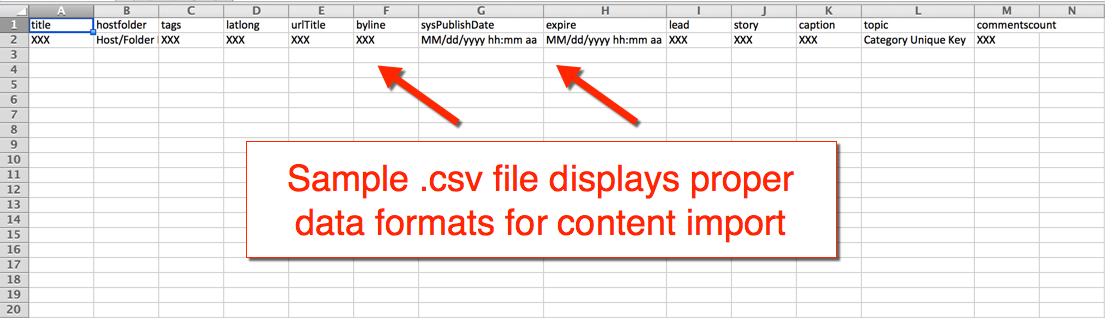 • If you are not sure about the formatting of a particular column heading, please preview fields in your selected Content Type prior to importing content.