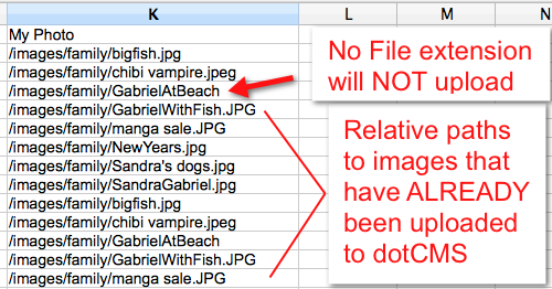 If the content type has an image field, images can be imported to the content as long as the images HAVE ALREADY BEEN UPLOADED to the Site Browser tree (Site -> Browser). Please note that the image paths in the CSV file (shown right), correspond to the dotCMS Site Browser tree on the host being imported to, NOT to the local file system of the user who is doing the import.