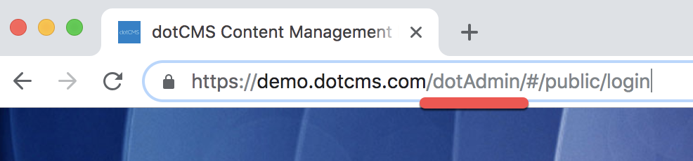 To sign in to the dotCMS back end, type the URL of the home page of your site, and add /dotAdmin to the end of the URL. For example, to sign in to the site http://demo.dotcms.com, you would type the URL http://demo.dotcms.com/dotAdmin.