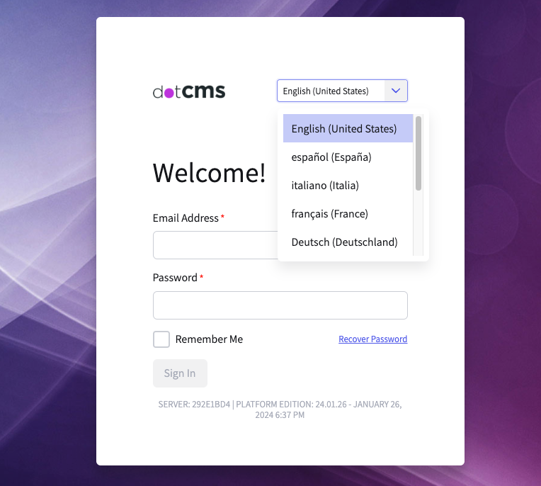 When you sign in to dotCMS, the language defaults to the default language configured for your dotCMS system. You may change the language used to display the backend by selecting the language in the upper-right corner of the login window: