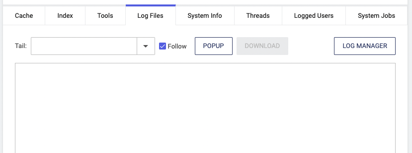 From this tab, you can view or manage your log files, utilizing dotCMS's flexible, extensible framework. For a detailed look at this feature, see Log File Viewing.