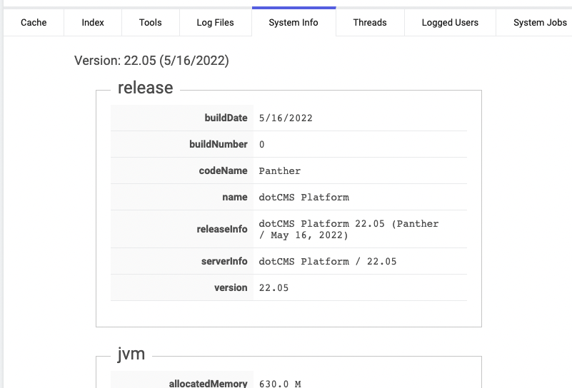 From the System Info tab, you can reference system and host properties, information about the dotCMS build, environment variables, and more.